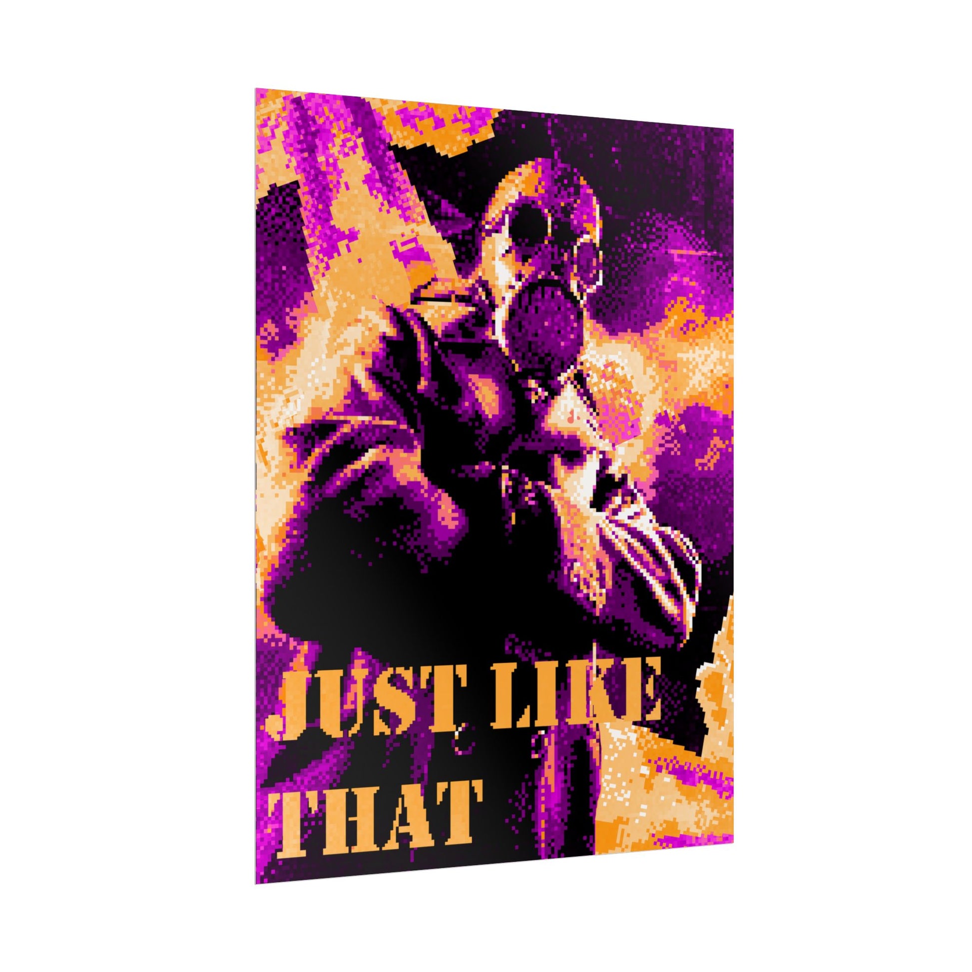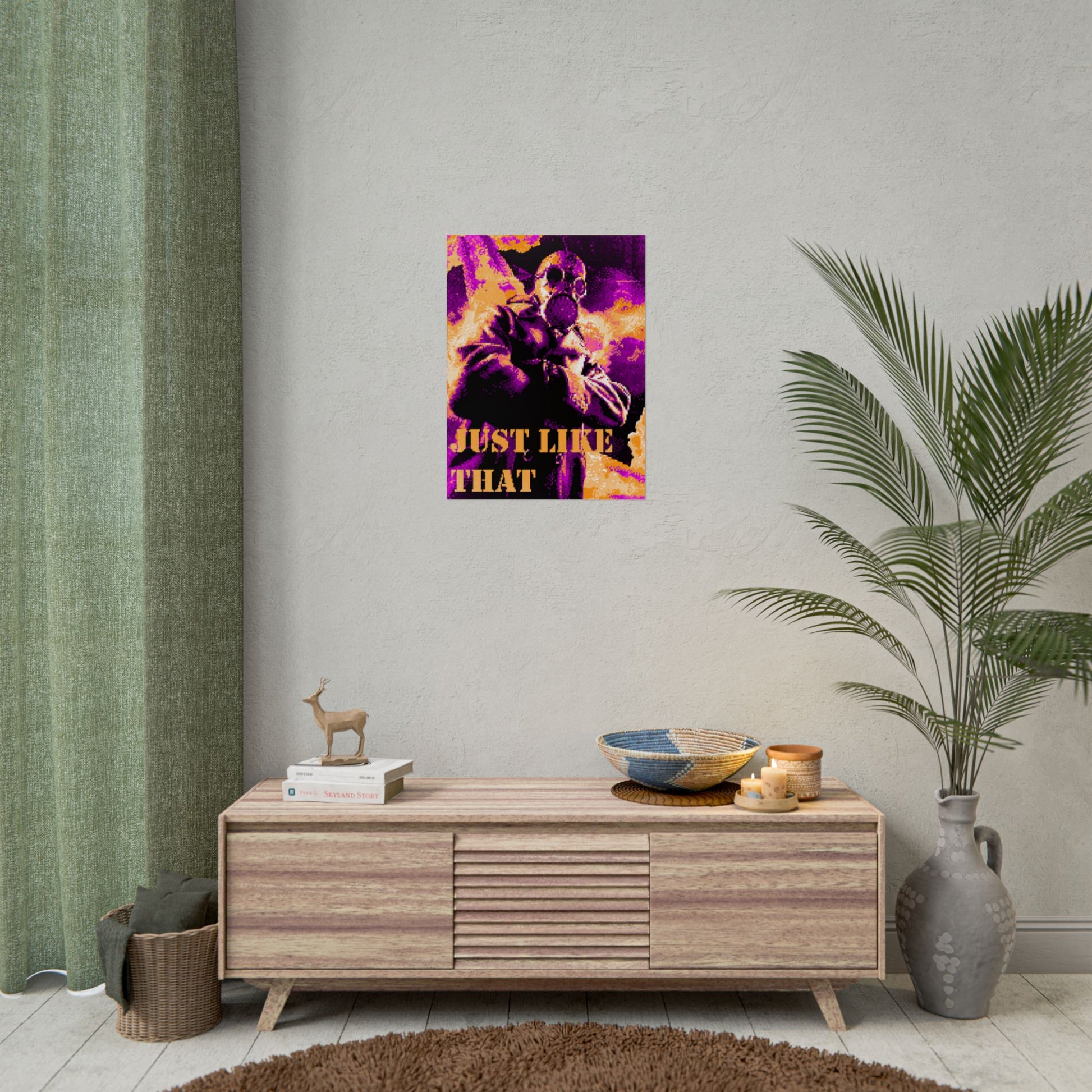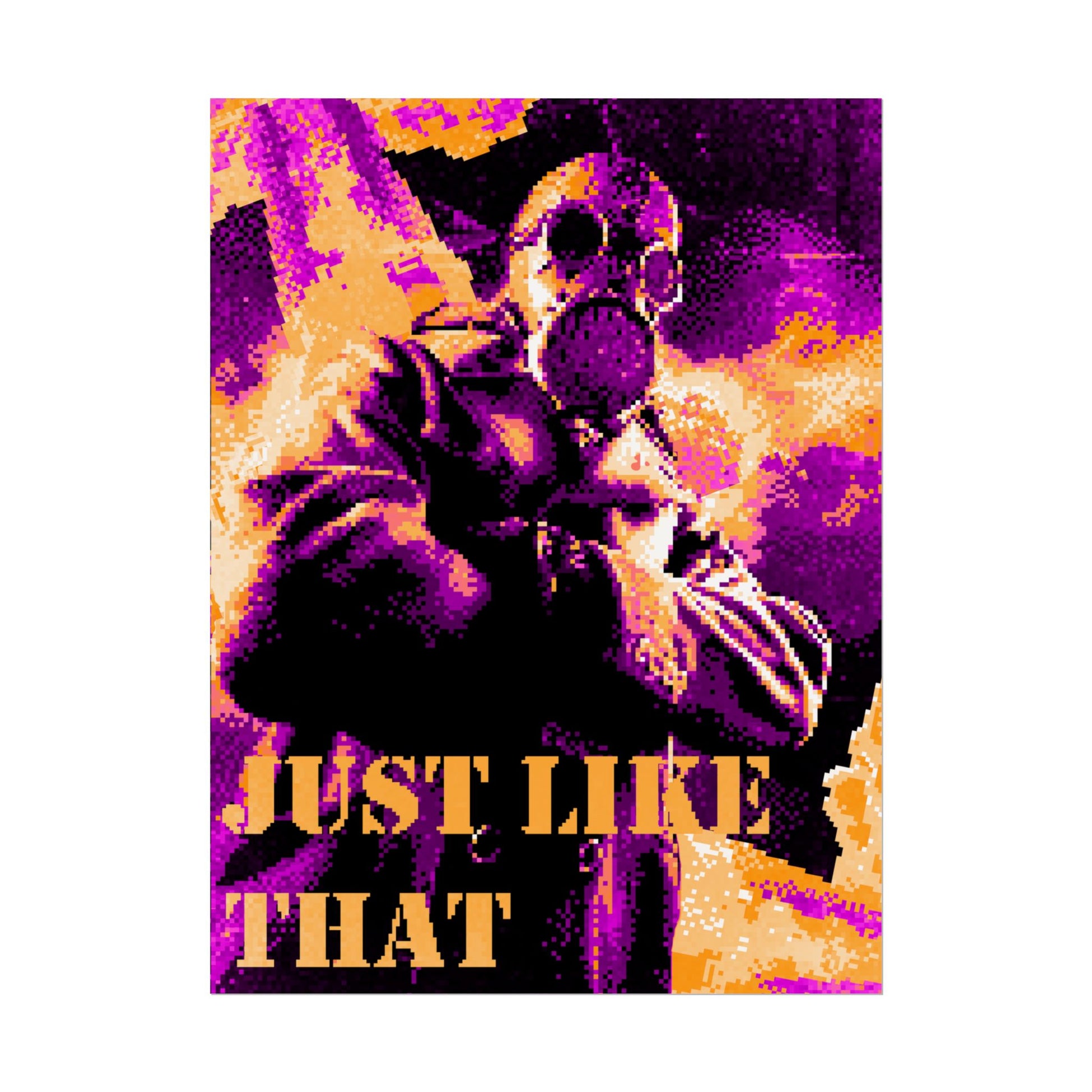 Turn up the attitude in your space with the "Just Like That" neon pixel art poster. This bold 18 by 24 inch semi-glossy print features a striking gas mask figure rendered in electric purple, orange, and gold hues, set against a vivid, fiery background. The eye-catching pixel art style and the powerful "JUST LIKE THAT" statement at the bottom make this poster perfect for anyone who loves cyberpunk, retro gaming, or urban-inspired wall art. Printed on high-quality semi-glossy paper, it offers a sleek finish that highlights every pixel and color pop. Add character to your bedroom, game room, or creative studio with this unique, motivational art piece that stands out from the crowd.